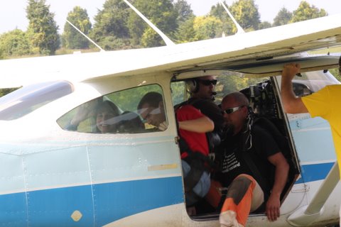 We were harnessed up, and neither one of us was going to back out. Before we knew it, we were in the tiny little plane and we were taking off.