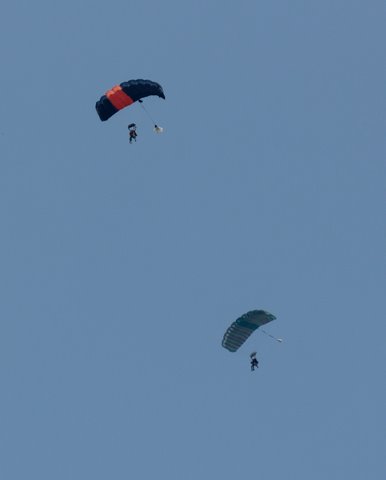 Now comes the really scary part. Below is a picture of both of our parachutes. Rob’s parachute is the one on the left and you can see in this picture that his chute only opened 75% of the way! Um…what’s that old saying? Oh yeah…you get what you pay for! Note: probably not the motto you want intermingled with your sky diving experience.