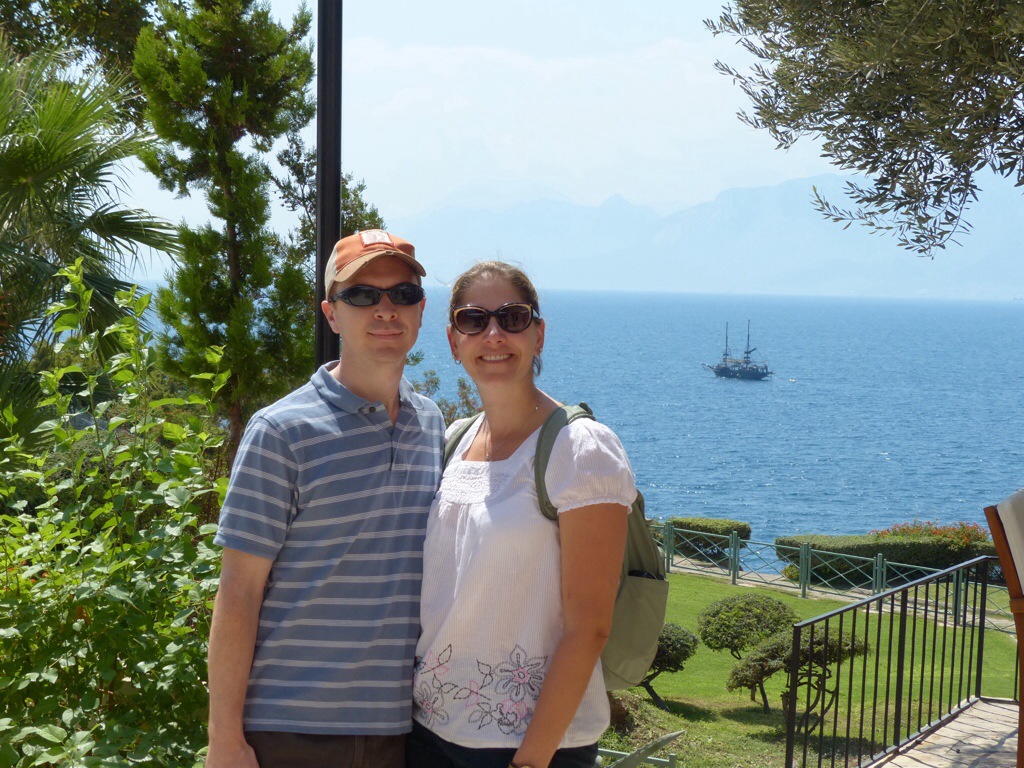 In addition to the beautiful ceramics, Turkey is famous for its carpets. I think our tour guide mentioned something to this effect, “Turkey is home to 1,000 mosques, and 1,000,000 (wait, or was it 100,000???) carpet shops!” He added that these figures were no longer accurate because Turkey has about 1,700 mosques now, but he probably wasn’t exaggerating about the carpet shop figures. Our good friend Mehmet (from the ceramic shop) told us there were over 30 carpet shops in the small old walled city of Kaleiçi alone. Even though we weren’t in the market to buy a Turkish carpet, somehow we found ourselves in the Kervan carpet shop. The owner offered us tea and then began educating us on the quality of Turkish carpets. The carpets truly were magnificent, but they were very expensive and not within our budget. But Rob was really getting into the idea of buying not just 1, but 3 carpets!!! He had really worked on his bargaining skills since our Grand Bazaar experience, and he had negotiated an amazing deal on 3 carpets. However, despite this amazing deal, we still couldn’t justify spending that kind of money. It was at that point that I started to worry Rob might have been debating trading his lovely wife in exchange for the 3 lovely carpets….