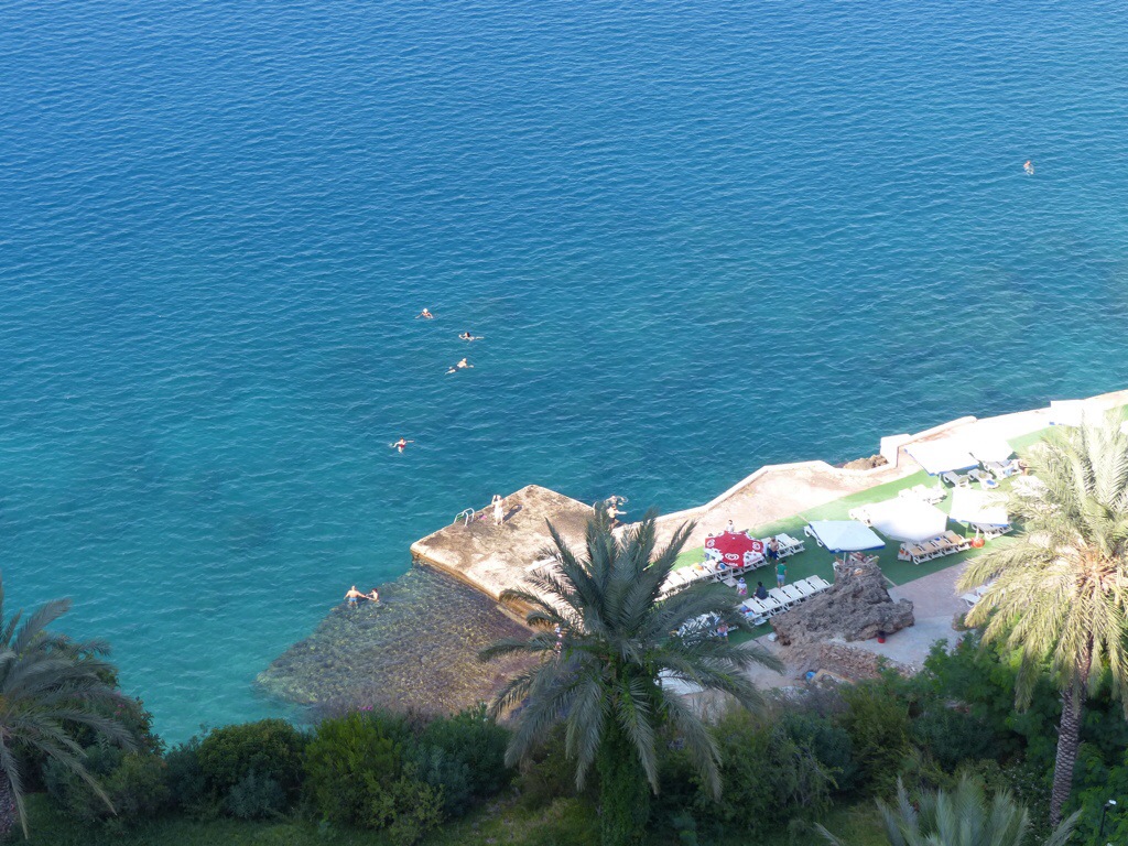 As many of you already know, I have a debilitating fear of sharks (and every other unfriendly thing in the water). So as a general rule, I only go into bodies of water when I can see absolutely everything around me. I’m talking about the crystal-clearest of waters. Unfortunately, the Mediterranean Sea didn’t meet my ridiculously strict criteria. Our hotel sat high above a cliff and there were stairs leading down to the water. But there wasn’t an actual beach there where you could slowly inch your way into the water. It was all or nothing. Jump in and chance death (#dramaqueen) or miss out on my first opportunity to swim in the Mediterranean Sea. What is a terrified girl to do?