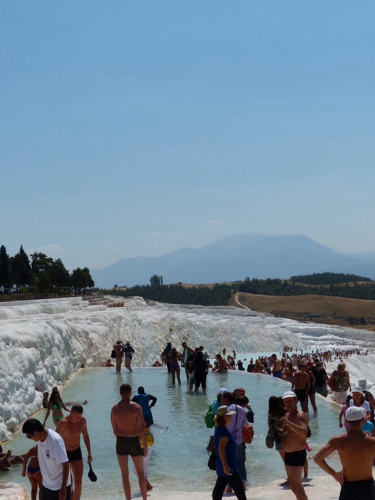 Pamukkale (pa-mook-ka-lay) means “cotton castle,” but you won’t find any cotton plantations here! The name refers to the color alone as the mountain is covered in white minerals. The area is filled with natural hot springs that deposit calcium carbonate in the water, which later hardens and turns into travertine. The views were amazing and the pictures just don’t do it justice!