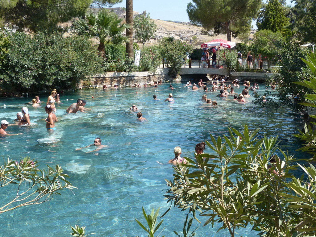 People have bathed in the pools of Pamukkale for thousands of years. Tourists are allowed to walk along the travertine terraces and bathe in the hot springs, but shoes may not be worn while walking on the minerals in order to protect the site.